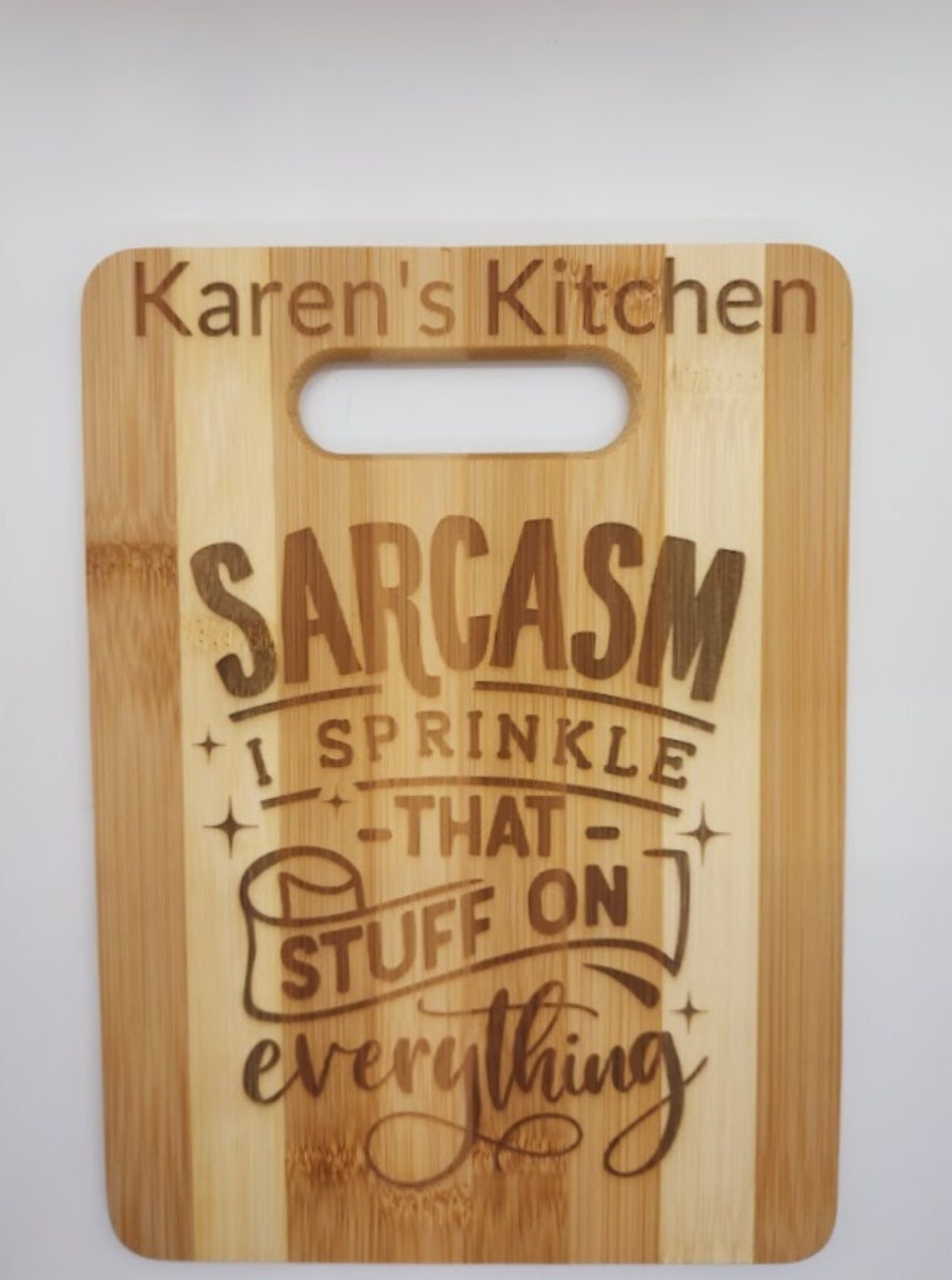 This cute 9.7 x 7.1 Bamboo cutting board has sarcastic sayings for any sassy person in your life. Personalized font will be closer to font in picture.